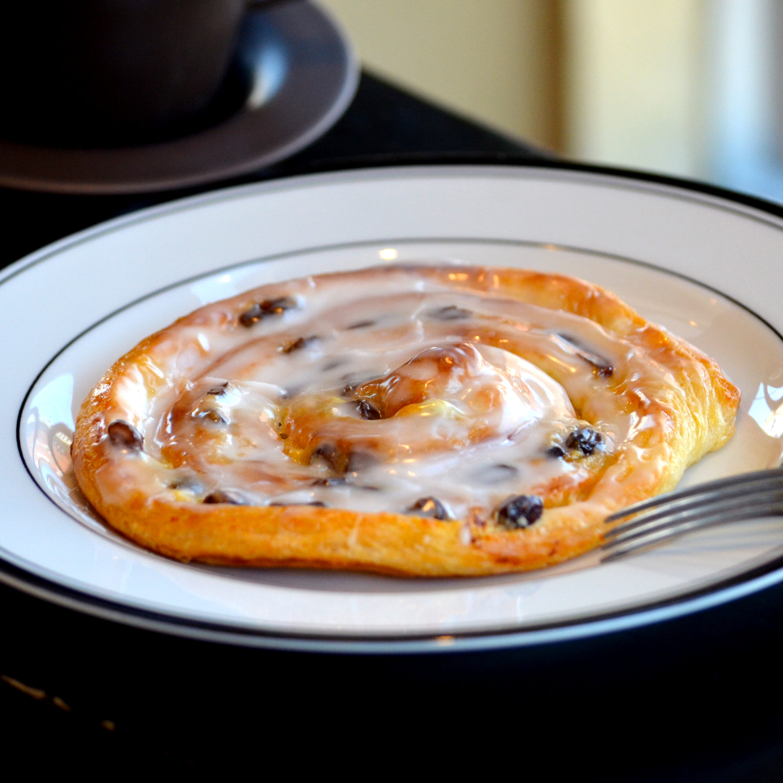 Danish dough with a pastry cream filling, almond frangipan, raisins, and topped with a vanilla fondant icing. An afternoon delight!